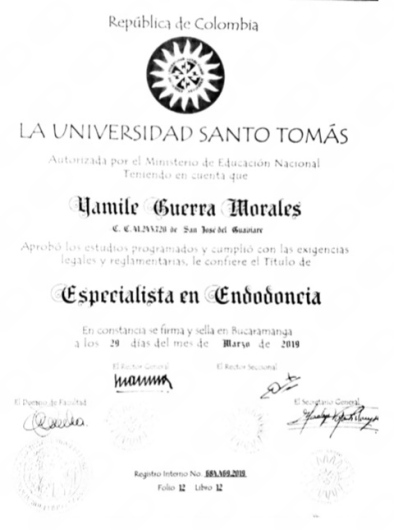 Soy Odontóloga Endodoncista graduada de la universidad del Bosque y Universidad Santo Tomas experta en salvar dientes, con capacidades en el manejo de tratamientos quirúrgicos y convencionales de las diferentes patologías apicales y demás alteraciones que así lo requieren, Tengo experiencia en el manejo de trauma dento alveolar, reabsorciones radiculares reimplante intencional y autotransplante dental.